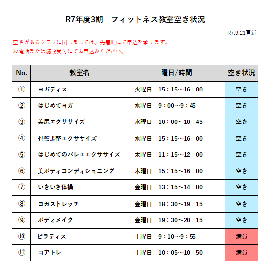 R7年度3期(10・11・12月)の抽選が終わりましたので、空き状況をお知らせいたします。