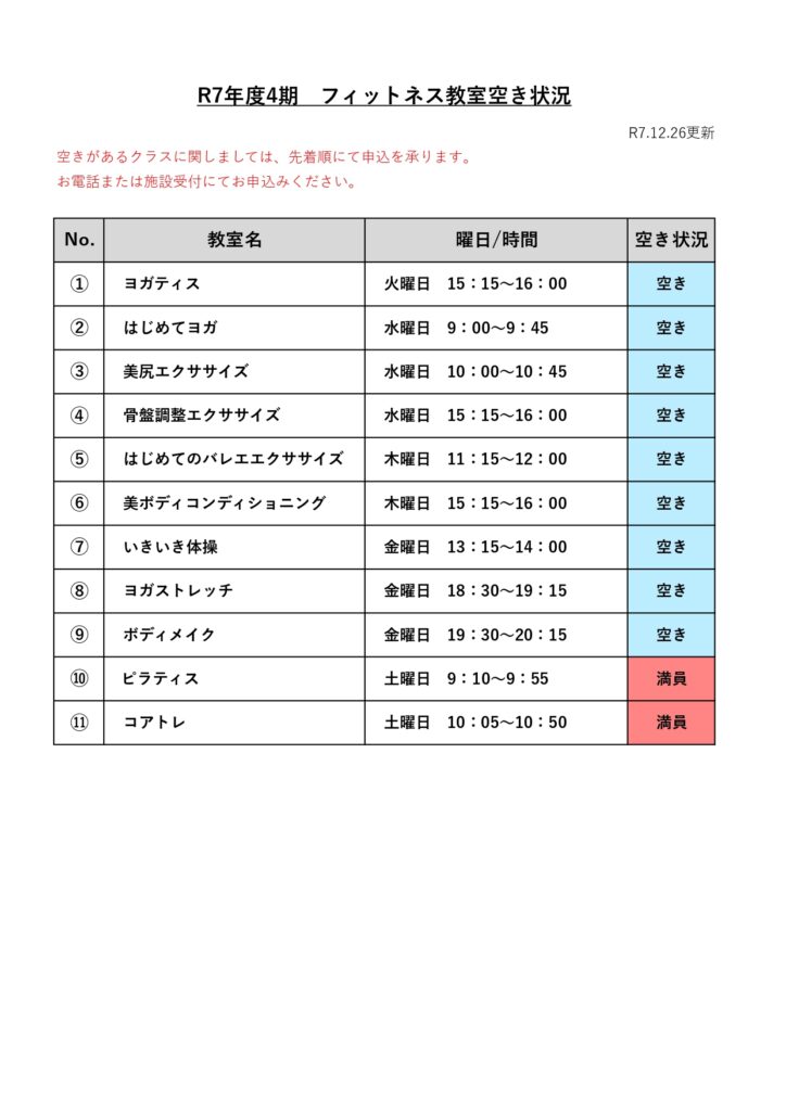 R7年度4期フィットネス教室 空き状況のご案内
